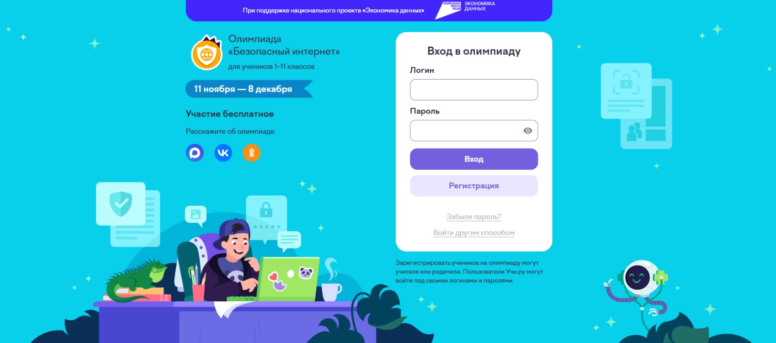 С 11 ноября по 8 декабря пройдет Всероссийская онлайн-олимпиада «Безопасный интернет», направленная на развитие у школьников навыков безопасного поведения в сети и ответственного использования современных технологий. К участию приглашаются ученики 1–11 классов со всей России. Олимпиада организована АНО «Национальные приоритеты» при поддержке Минцифры России, национального проекта «Экономика данных» и образовательной платформой Учи.ру.